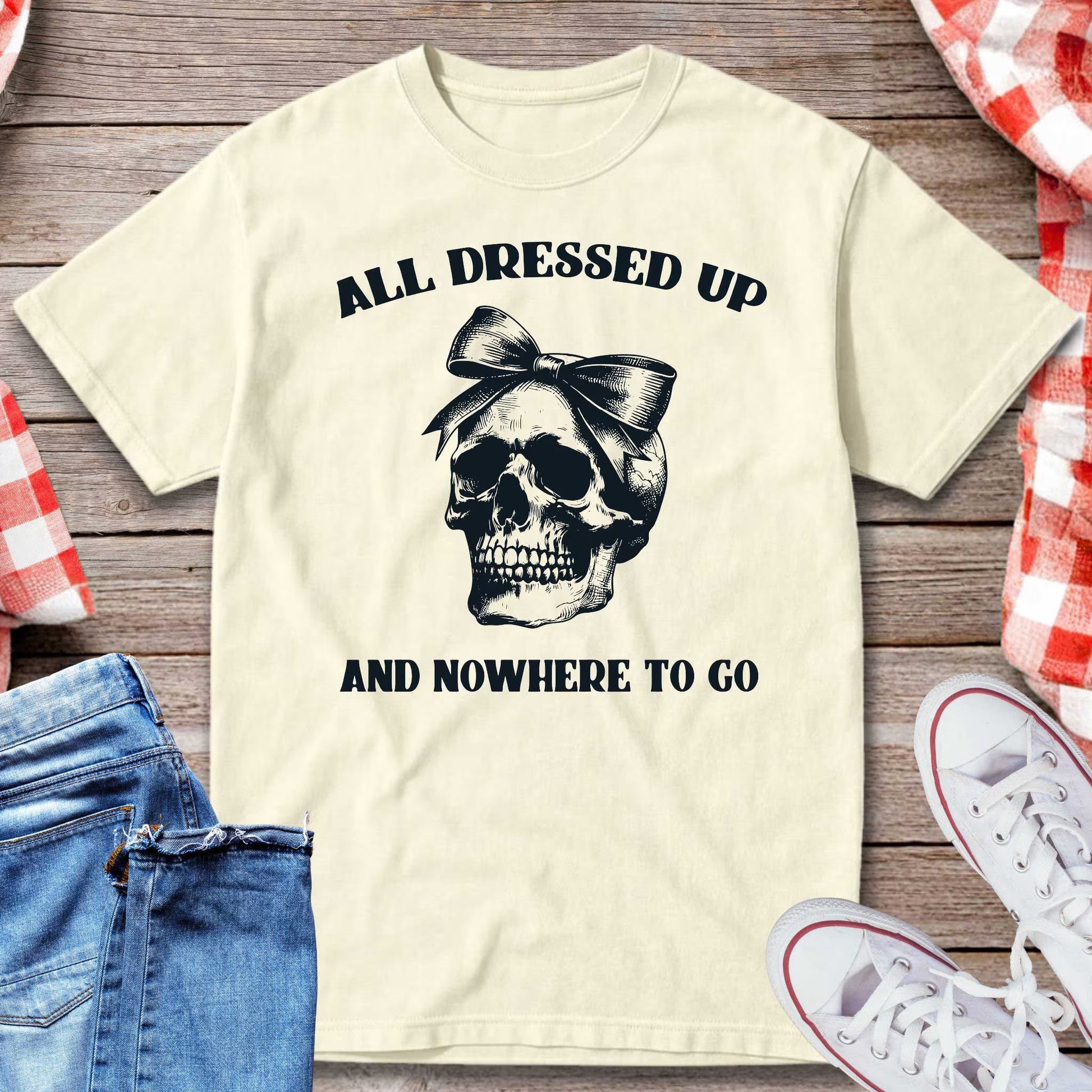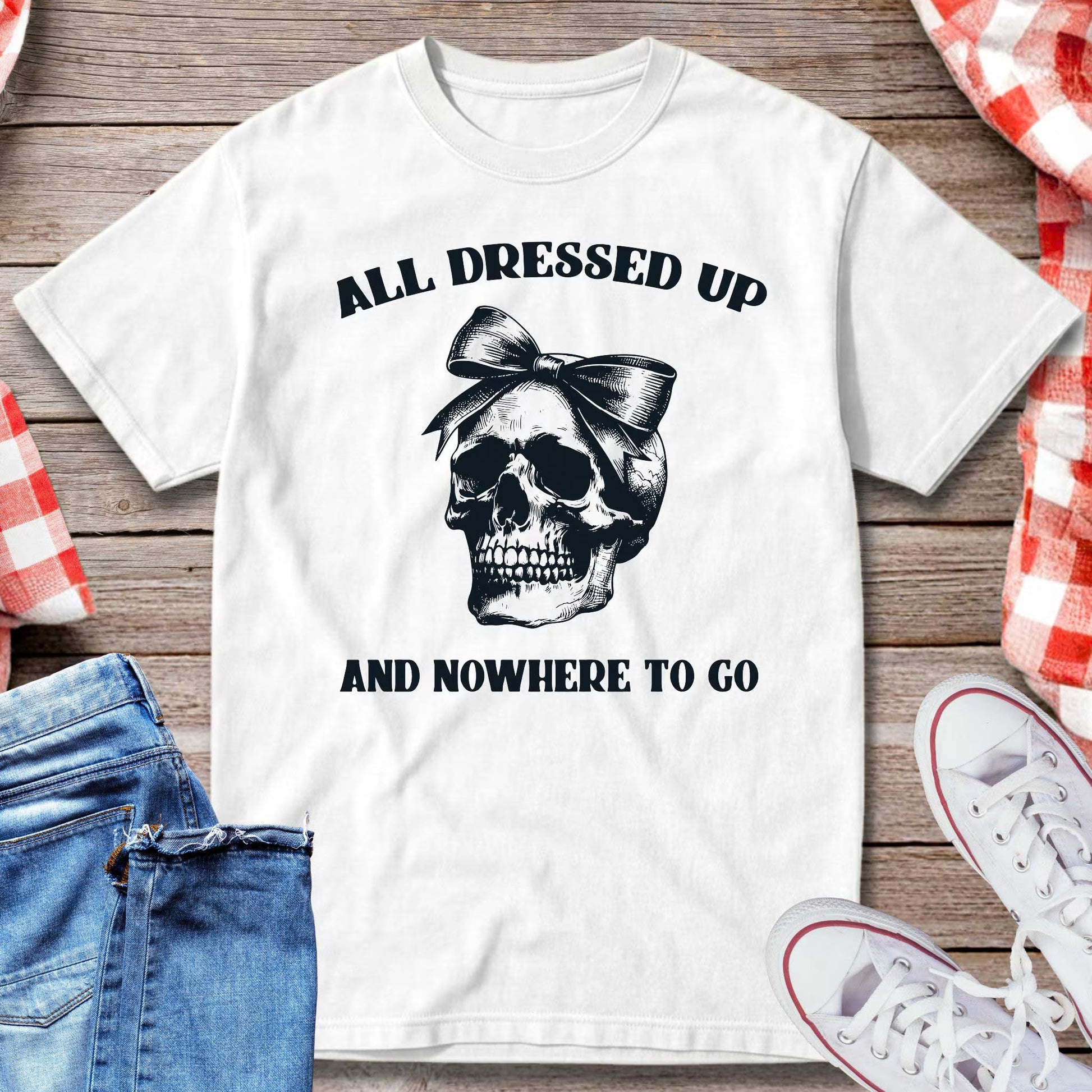 Dark humor meets bold style with this striking graphic tee. Featuring a detailed skull wearing a bow and the phrase “All Dressed Up And Nowhere To Go,” it’s the perfect blend of gothic edge and sarcastic wit. Whether you’re lounging at home or making a statement out, this shirt is made for those who embrace irony with style.