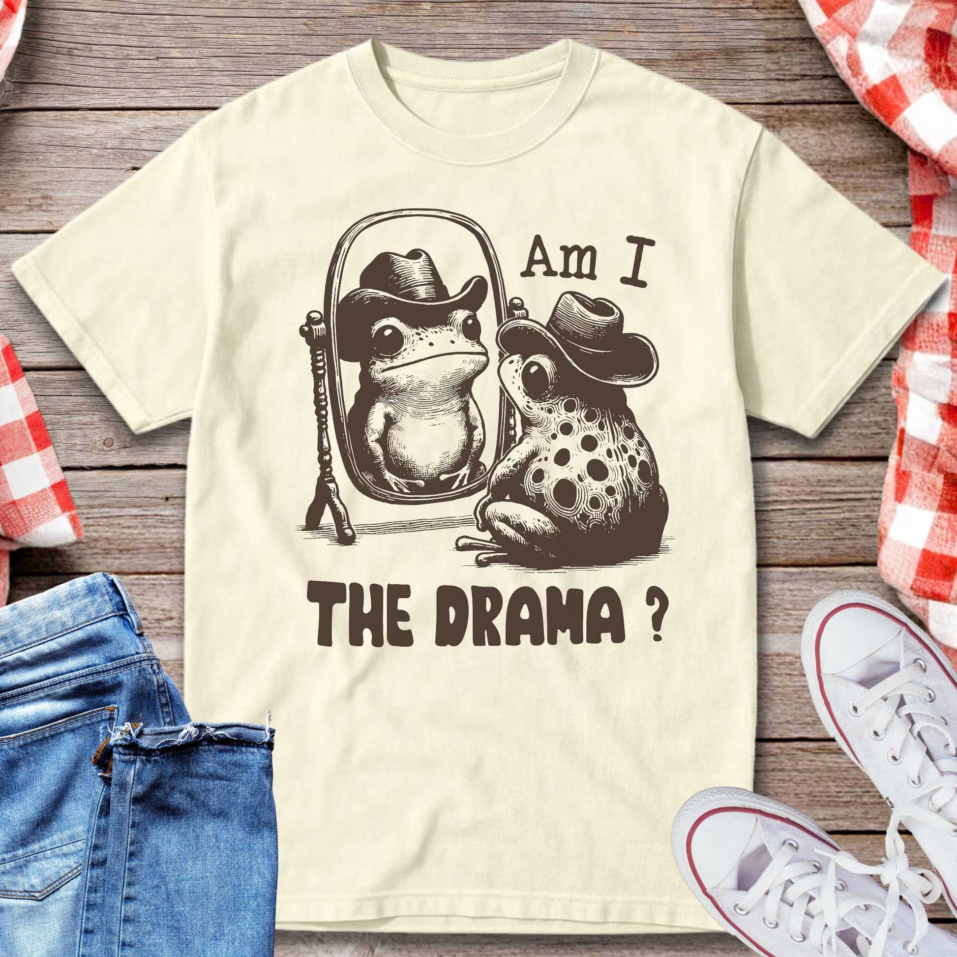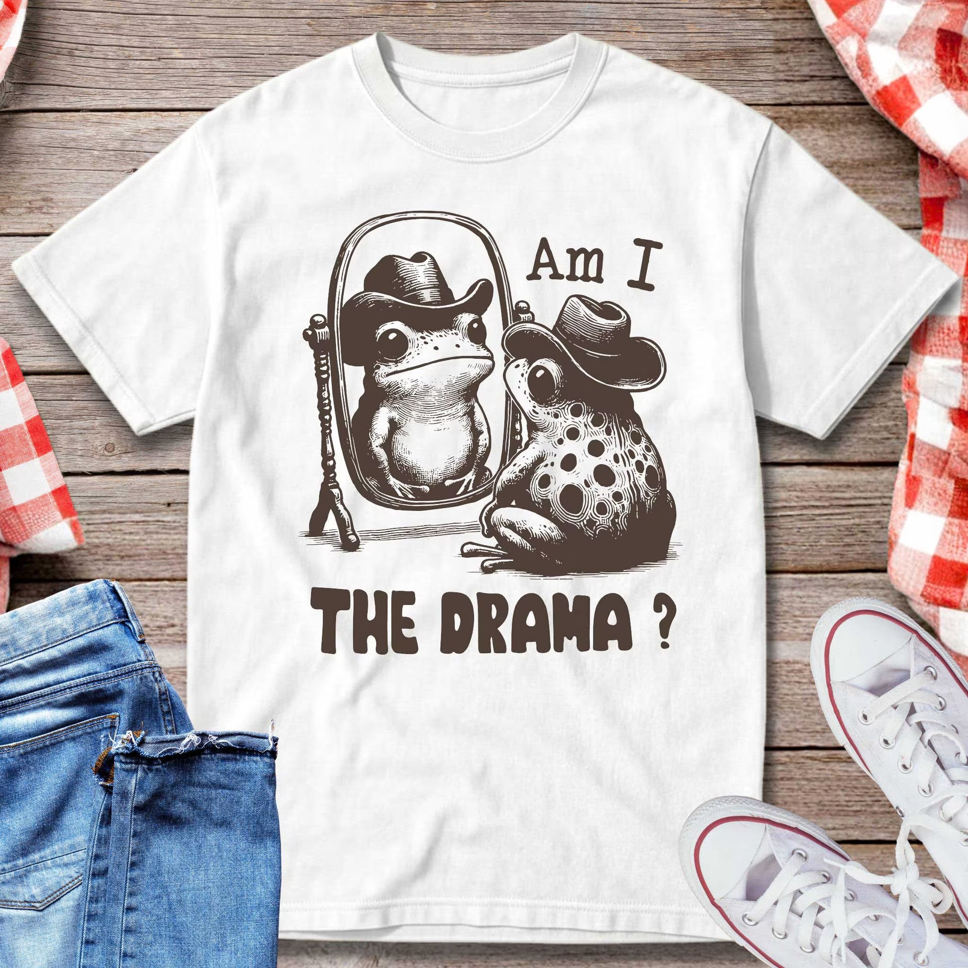 Serve humor and self-reflection in style with this playful graphic tee. Featuring a cowboy-hat-wearing frog staring into a mirror with the phrase “Am I The Drama?”, this shirt is perfect for anyone who embraces their dramatic side with a wink of irony. Fun, comfy, and full of personality, it’s a must-have for your casual rotation.