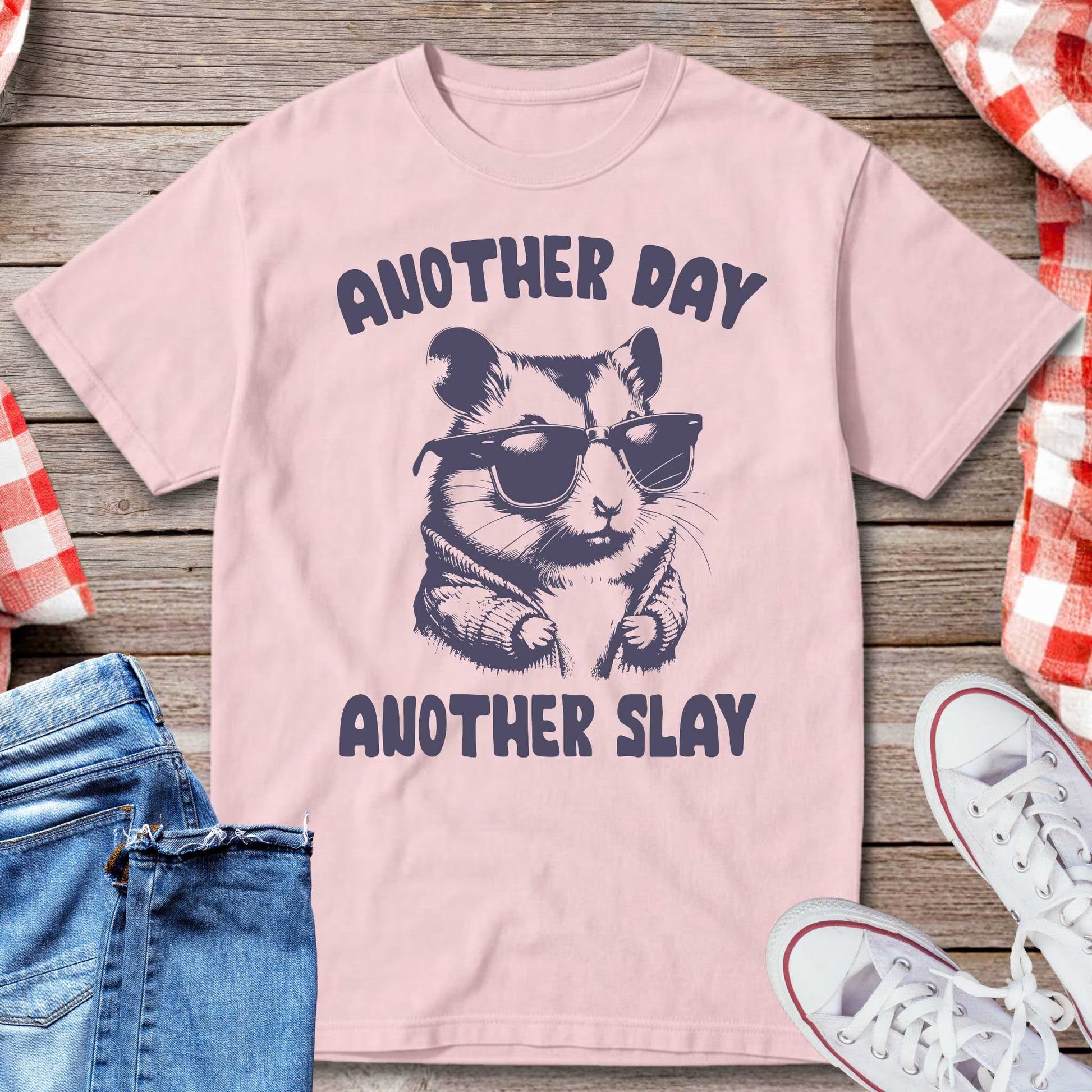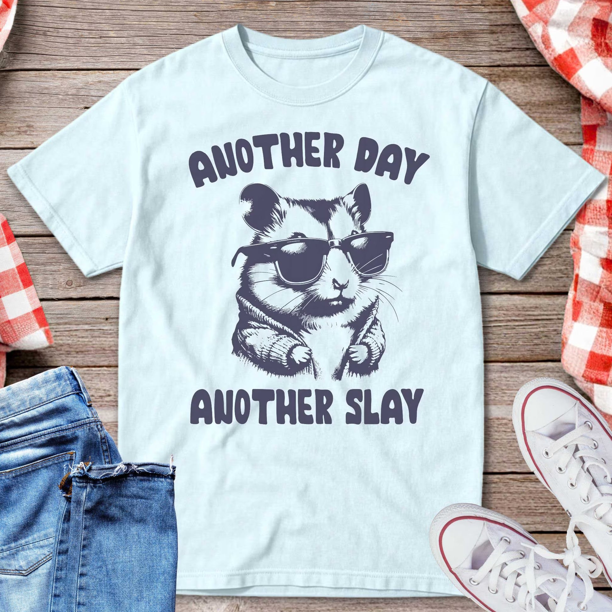 Step into every day with confidence in this fun and sassy graphic tee. Featuring a cool hamster rocking sunglasses and the phrase “Another Day Another Slay,” this shirt is perfect for anyone who loves serving style with a sense of humor. Comfortable, casual, and effortlessly bold, it’s the ultimate everyday vibe booster.