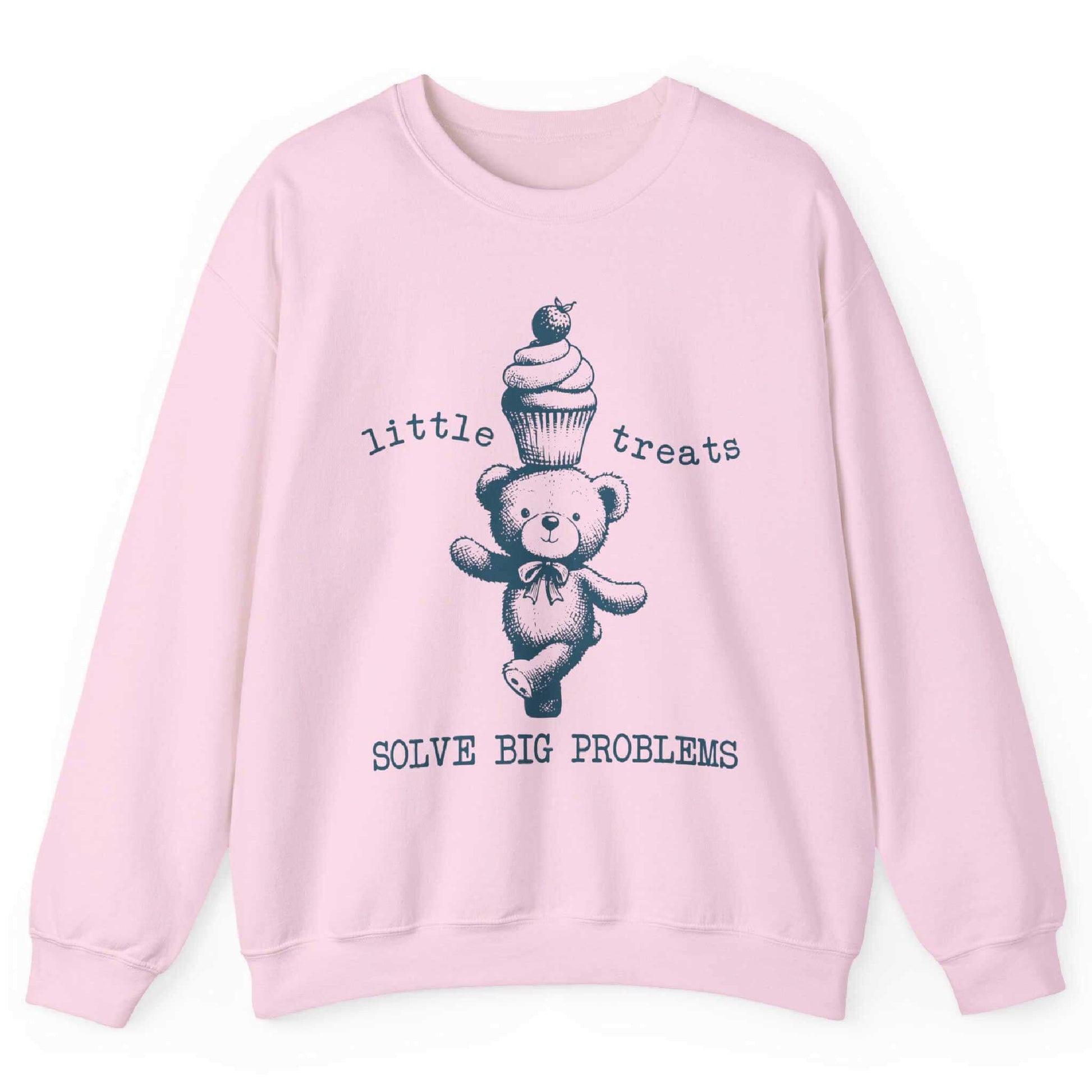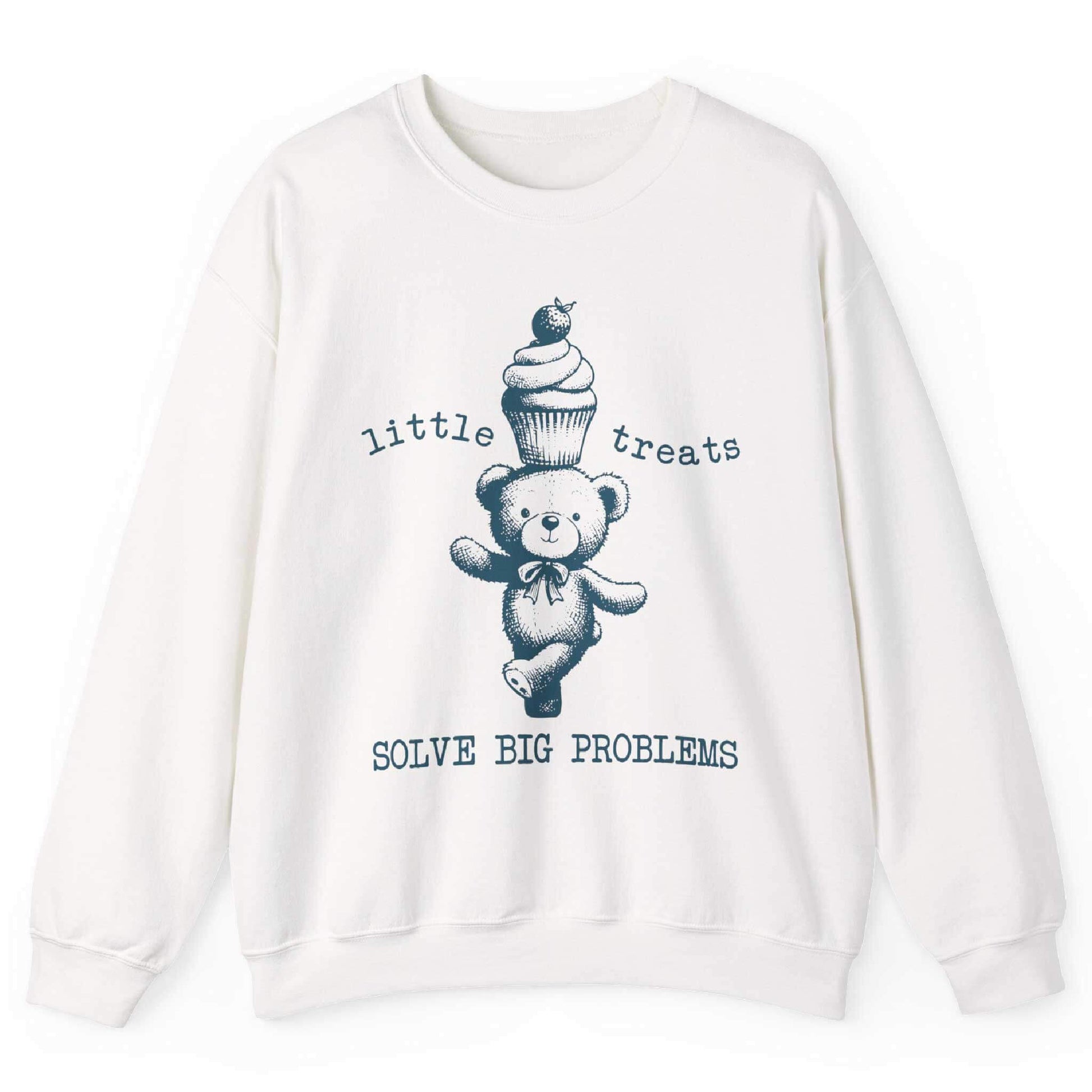 Cozy comfort meets sweet charm in this adorable sweatshirt. Featuring a teddy bear balancing a cupcake with the uplifting phrase “Little Treats Solve Big Problems,” this piece is perfect for those who believe dessert makes everything better. Soft, warm, and effortlessly cute, it’s ideal for lounging, layering, or spreading a little joy wherever you go.