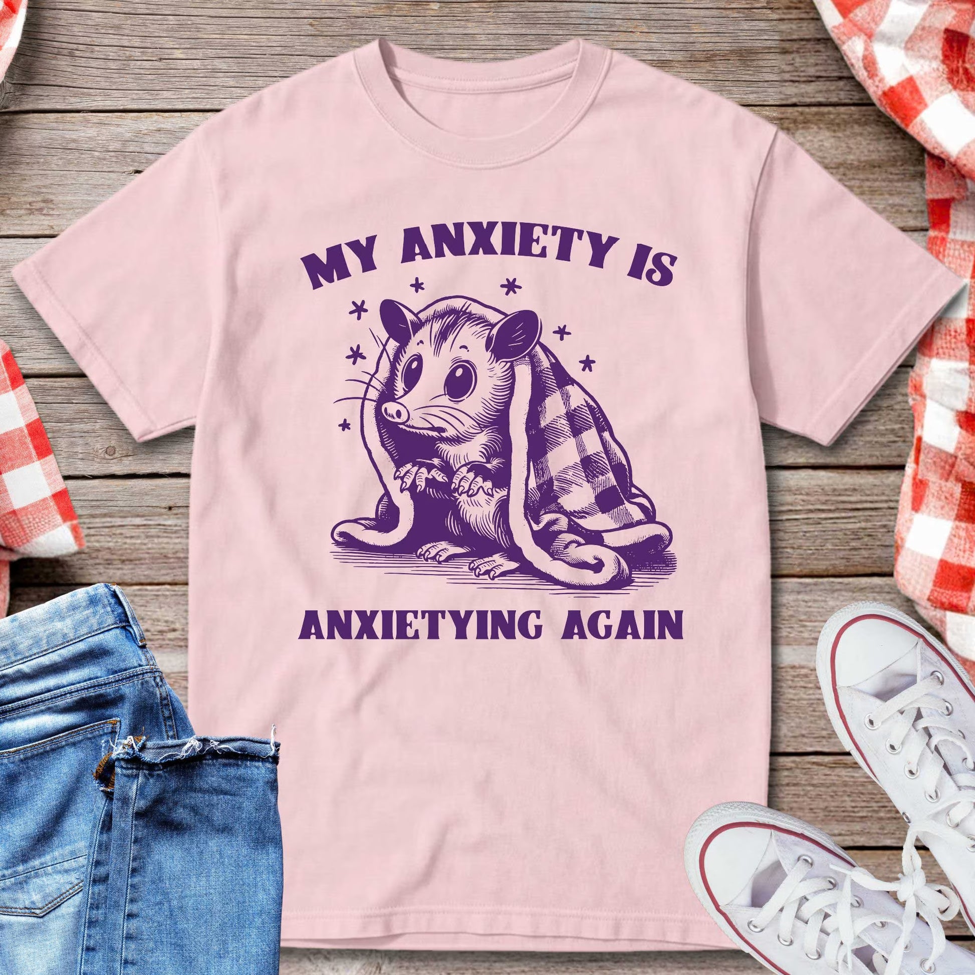 Relatable, funny, and a little too real—this t-shirt says what we’re all thinking with a cute, anxious critter under a blanket and the phrase “My Anxiety Is Anxietying Again.” Perfect for anyone who copes with humor, this tee blends comfort with personality, making it a great pick for casual days, lounging, or gifting to a fellow overthinker.