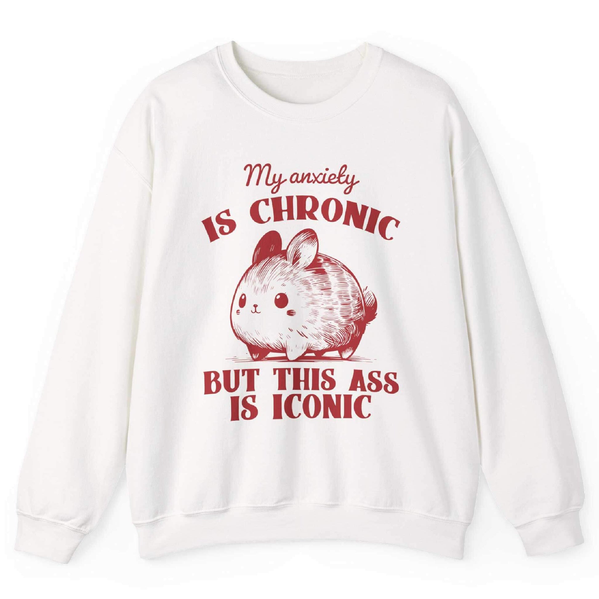 This sweatshirt is the perfect mix of sass and self-awareness. Featuring a chubby bunny with the bold phrase “My Anxiety Is Chronic But This Ass Is Iconic,” it’s equal parts hilarious and empowering. Designed for comfort and confidence, it’s the go-to piece for anyone who owns their struggles but never forgets their shine.