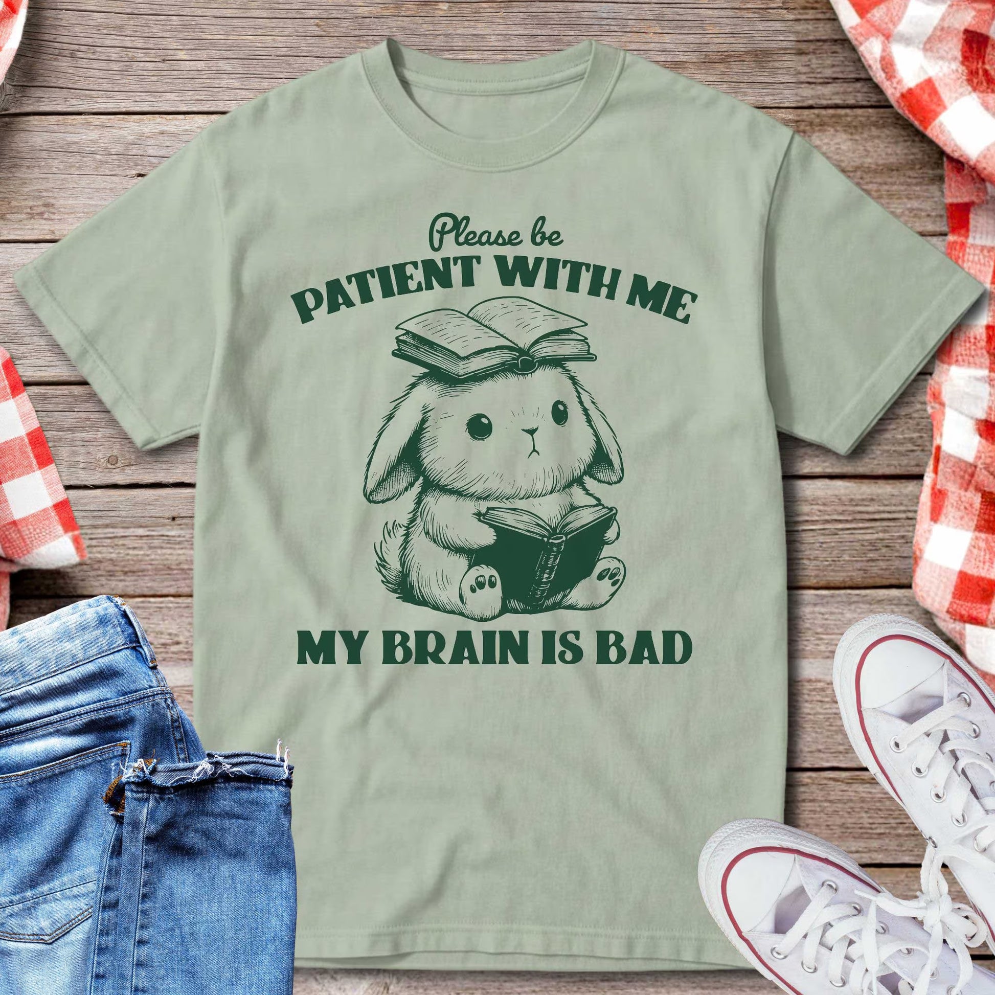 Adorable and relatable, this t-shirt features a sweet bunny holding a book with another perched on its head, paired with the phrase: “Please be patient with me, my brain is bad.” It’s the perfect blend of cute and self-aware humor, making it an instant favorite for casual days, study sessions, or gifting to a friend who loves playful honesty.