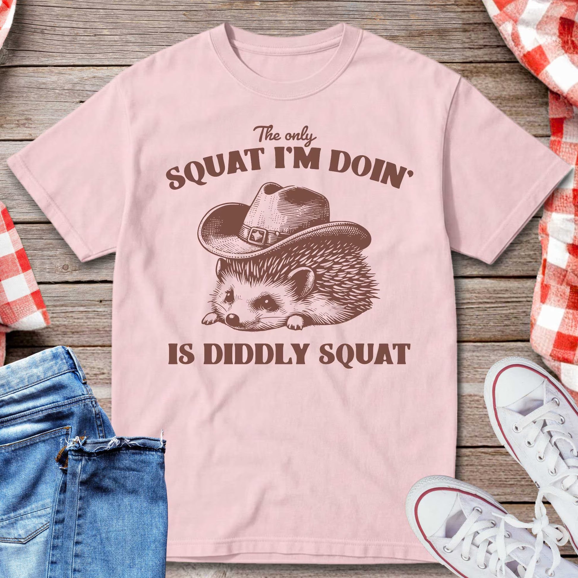 Lazy never looked this cute. This t-shirt features a cowboy-hat-wearing hedgehog with the hilarious phrase: “The only squat I’m doin’ is diddly squat.” Perfect for anyone who prefers chill over hustle, this tee brings cozy humor to your wardrobe. Great for everyday wear, lounging, or gifting to a friend who embraces the slow life.