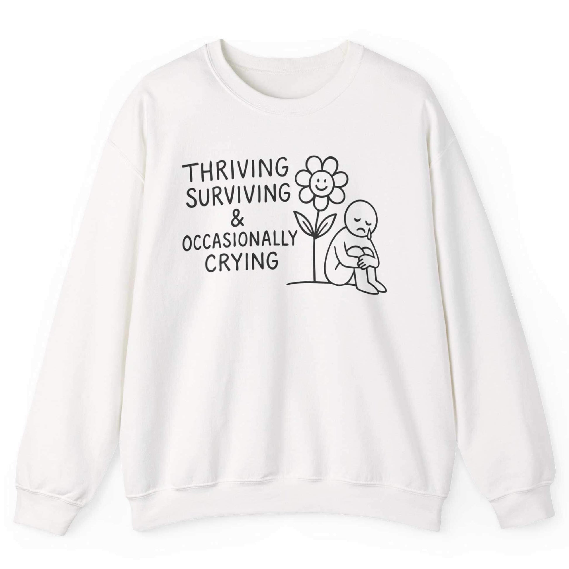 Because life is all about balance, this sweatshirt captures the ups, downs, and everything in between. Featuring a sweet doodle of a happy flower and a little figure sitting with the phrase “Thriving, Surviving & Occasionally Crying,” it’s funny, relatable, and perfectly cozy. A must-have for anyone navigating the chaos of life with humor and honesty.