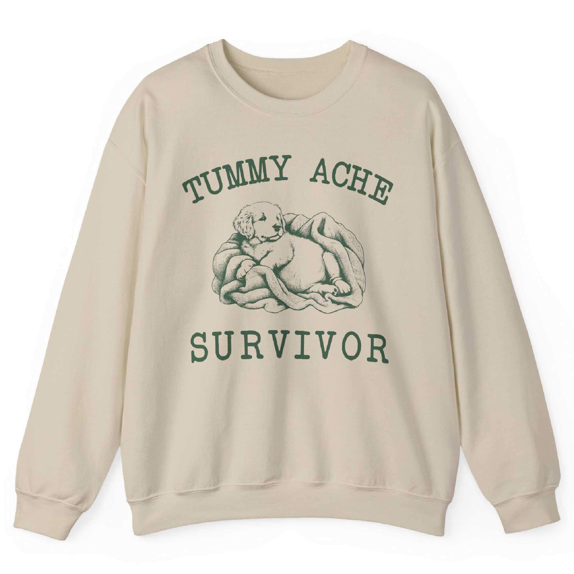 Wear your resilience with humor in this cozy sweatshirt. Featuring a sweet puppy curled up in a blanket with the phrase “Tummy Ache Survivor,” it’s the perfect mix of cute and funny. Soft, comforting, and relatable, this sweatshirt is made for anyone who’s ever battled through the not-so-glamorous moments of life and came out stronger (and cozier).